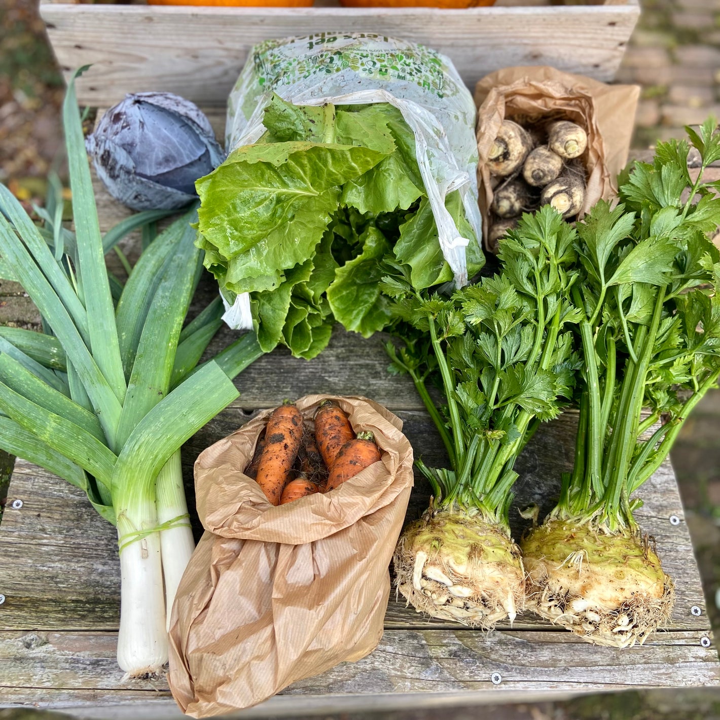 Onze groentetassen oogsten we iedere dag vers op bestelling en bestaan uit een selectie van onze favoriete seizoensgroenten!